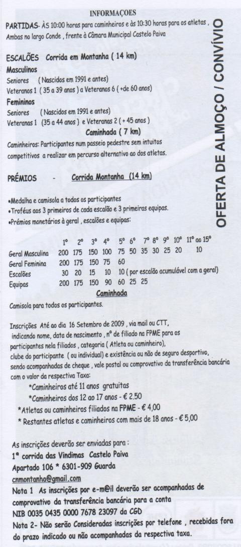 Competição integrada no Circuito Nacional de Montanha Salomon 2009. Prova com extensão de 14Km para os atletas e ainda uma caminhada pedestre com extensão de aproximadamente 7Km sem fins competitivos. Inclui almoço/ convívio. Participe!!